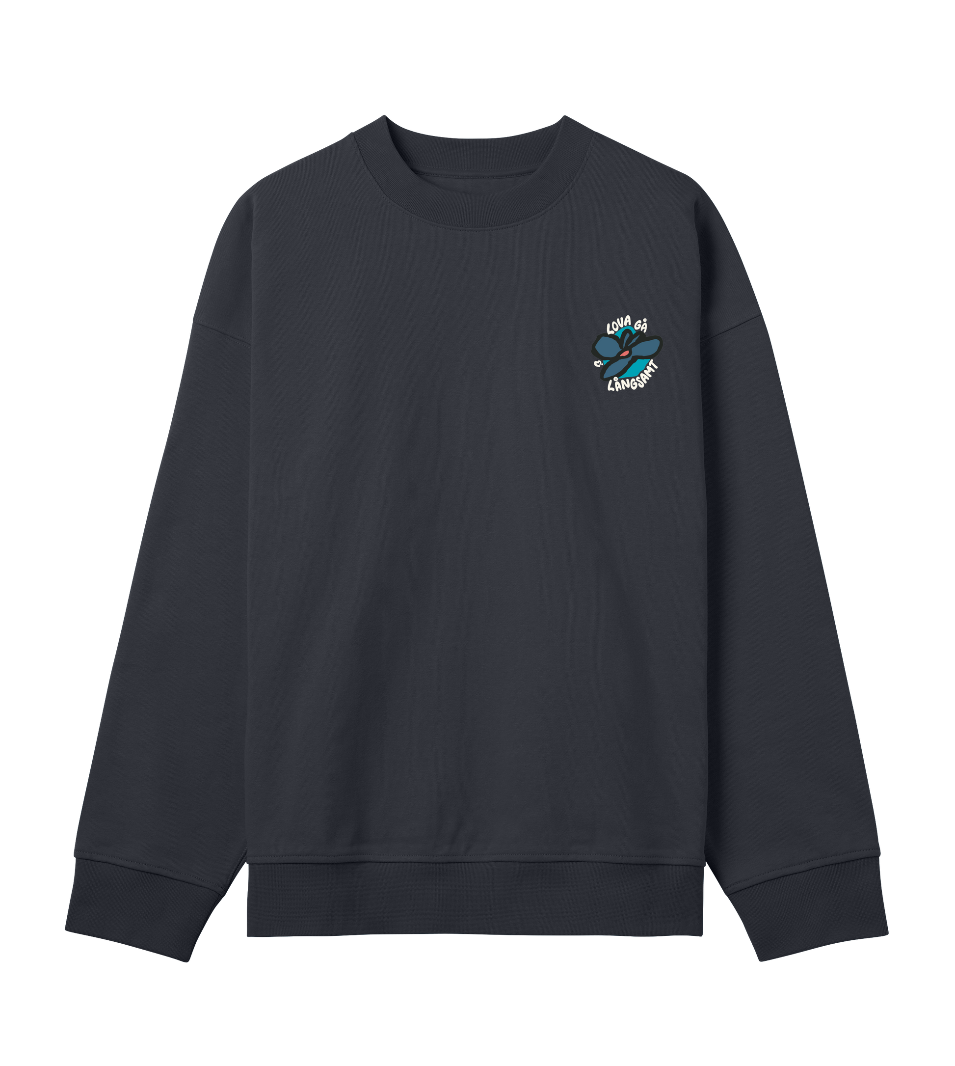 Off black oversized sweatshirt med lova gå långsamt-blomma på bröstet.